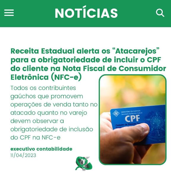Leia maisTodos os contribuintes gaúchos que promovem operações de venda tanto no atacado quanto no varejo devem observar a obrigatoriedade de inclusão do CPF na NFC-e A Receita Estadual (RE) ratifica a obrigatoriedade de inclusão do CPF do cliente na Nota Fiscal de Consumidor Eletrônica (NFC-e) de venda, realizada por estabelecimentos que promovem operações de comércio tanto no atacado quanto no varejo, os denominados “Atacarejos&rdqu...